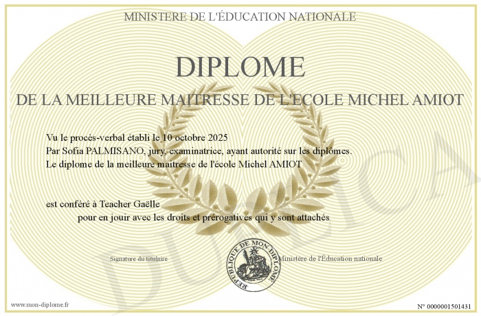 Envoyez par email votre diplôme de la meilleure maitresse de l'école Michel AMIOT personalisé