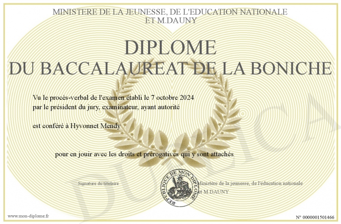 Envoyez par email votre Diplôme du baccalaureat de la boniche personalisé