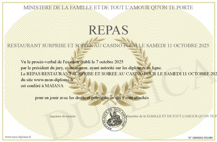 Envoyez par email votre REPAS RESTAURANT SURPRISE ET SOIREE AU CASINO POUR LE SAMEDI 11 OCTOBRE 2025 personalisé