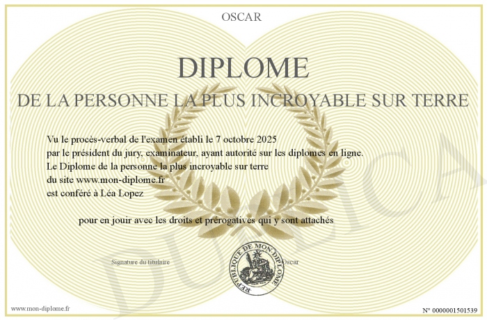 Envoyez par email votre Diplôme de la personne la plus incroyable sur terre personalisé