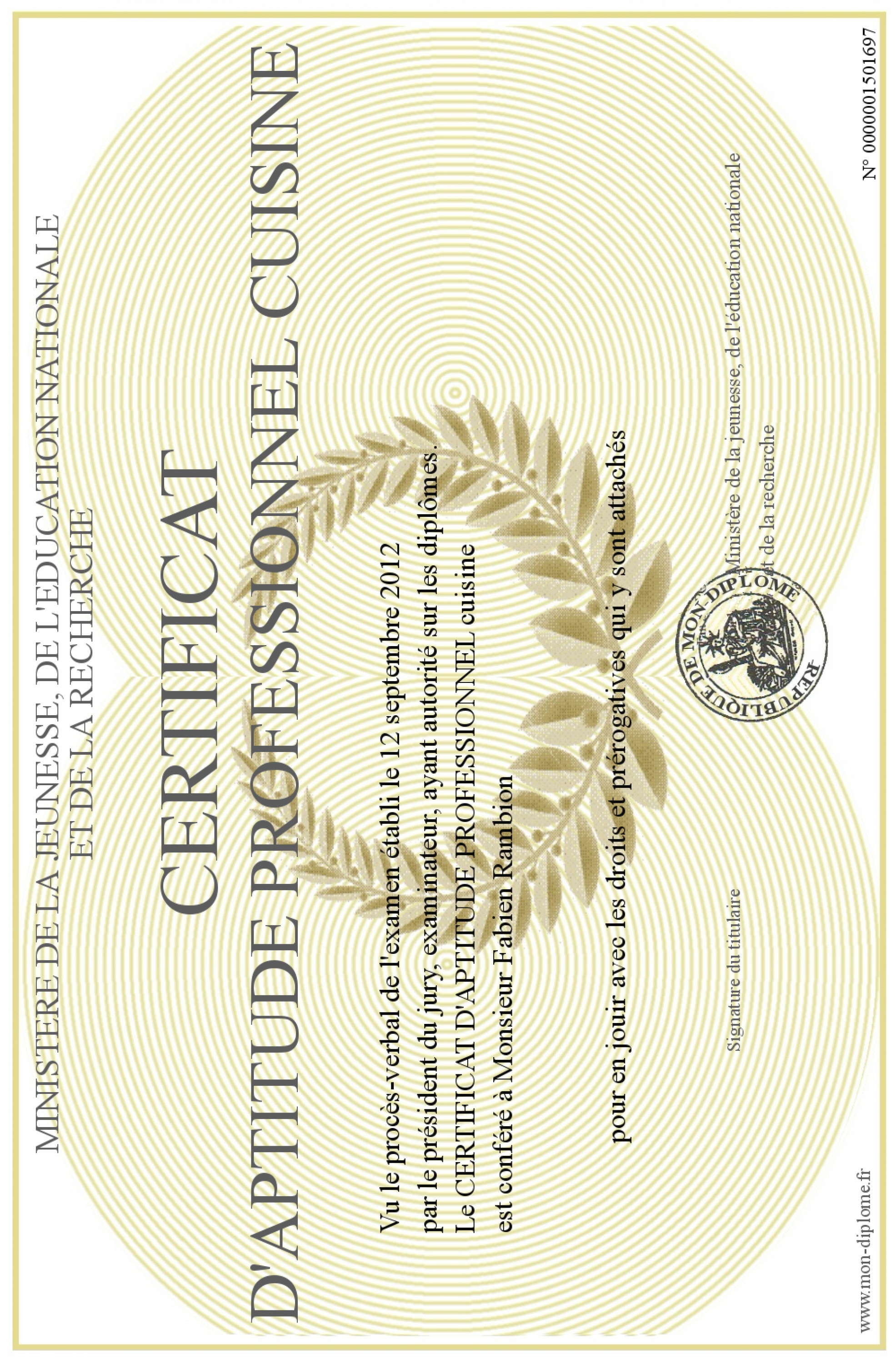 Envoyez par email votre CERTIFICAT D'APTITUDE PROFESSIONNEL cuisine personalisé