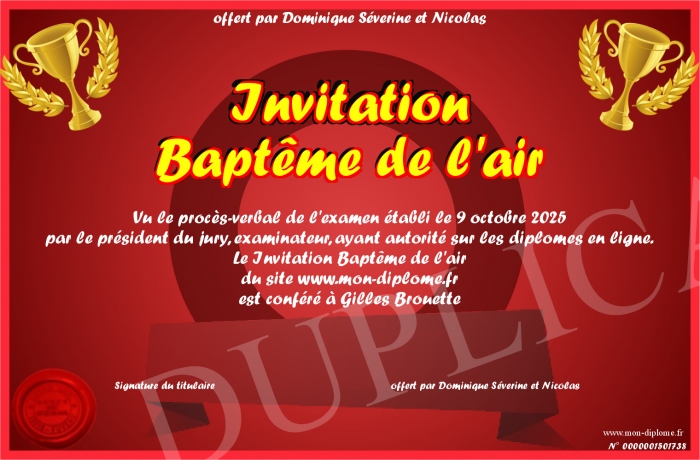 Envoyez par email votre Invitation Baptême de l'air personalisé
