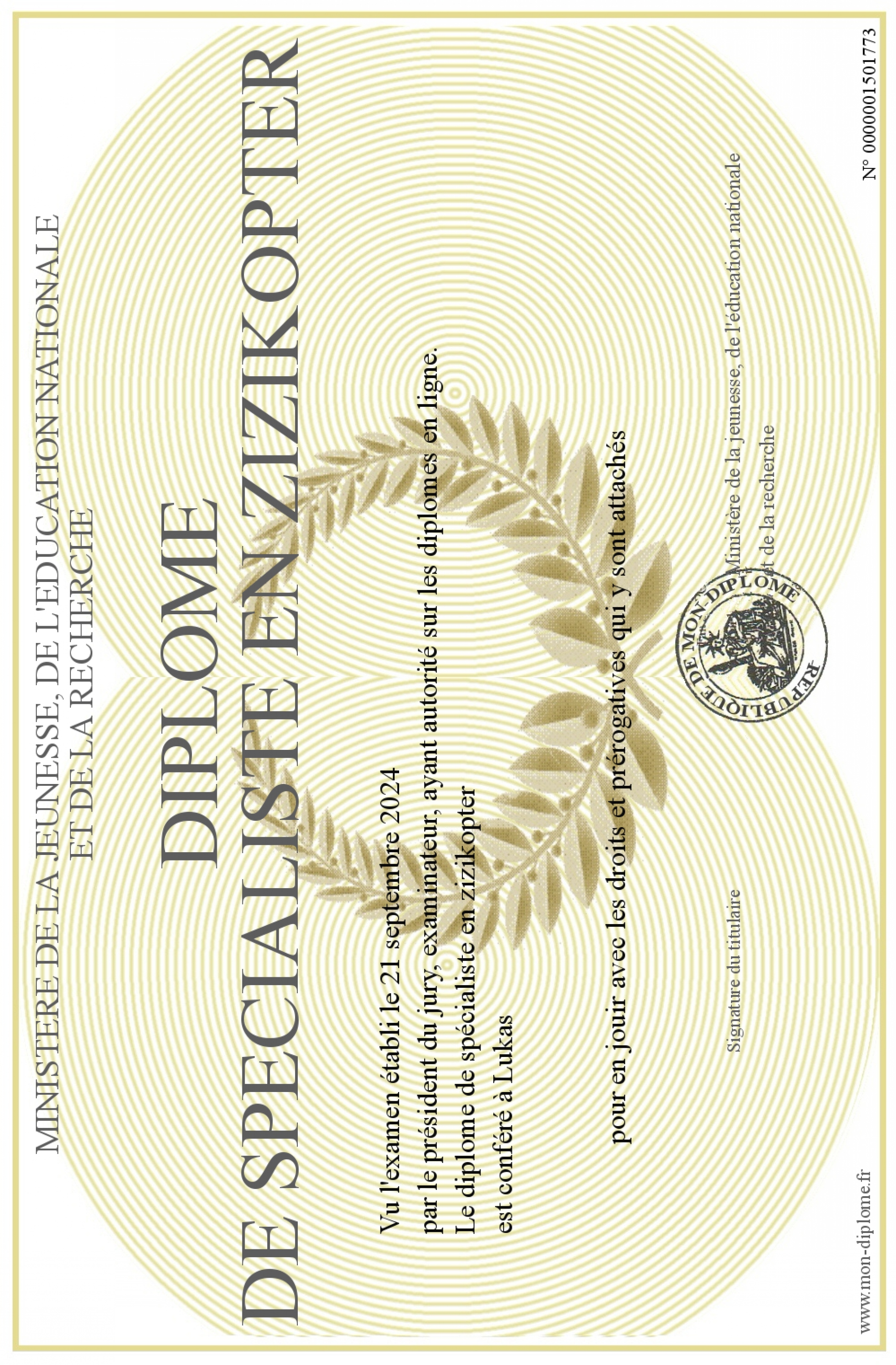 Envoyez par email votre diplôme de spécialiste en zizikopter personalisé