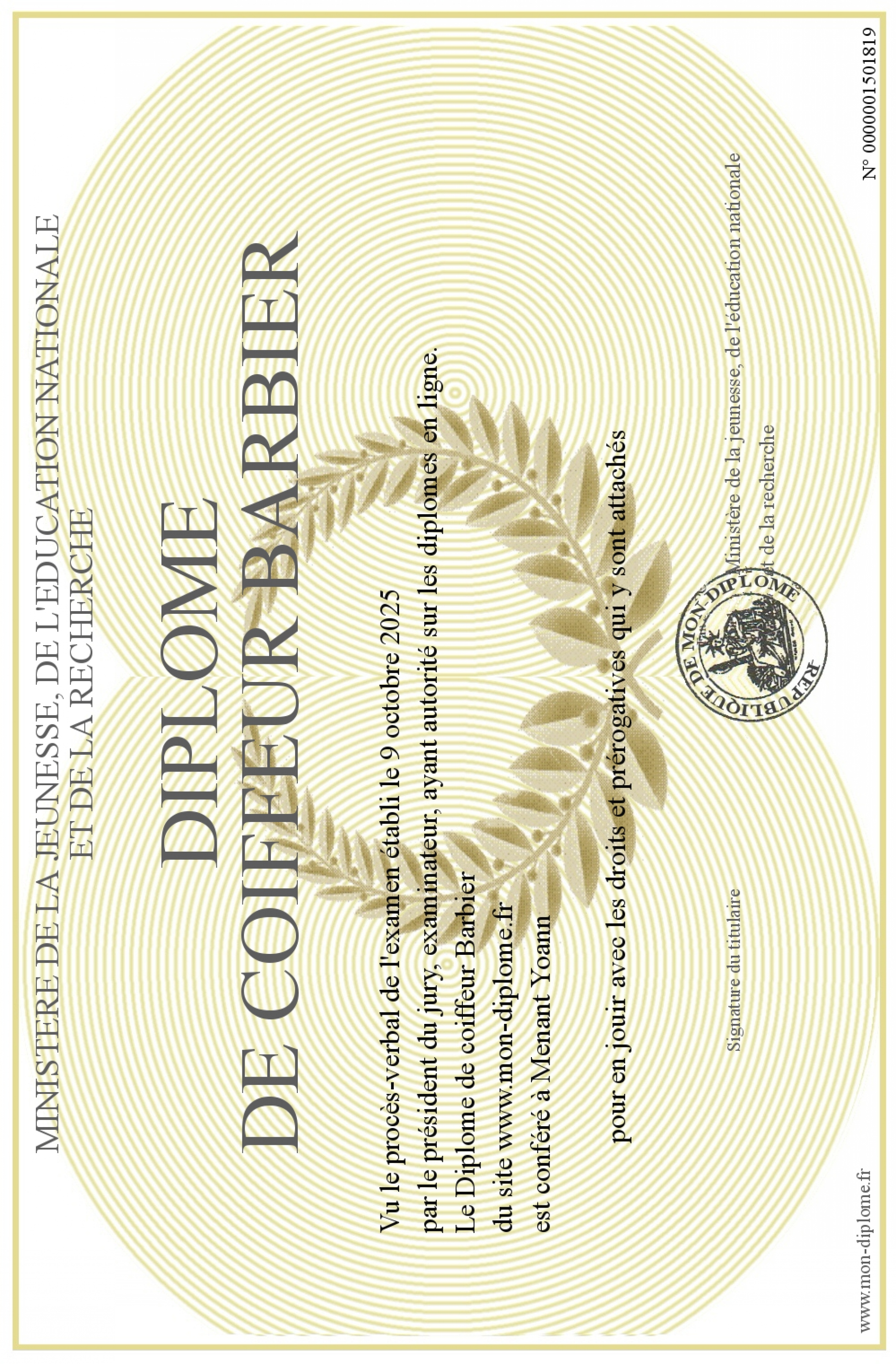 Envoyez par email votre Diplôme de coiffeur Barbier personalisé