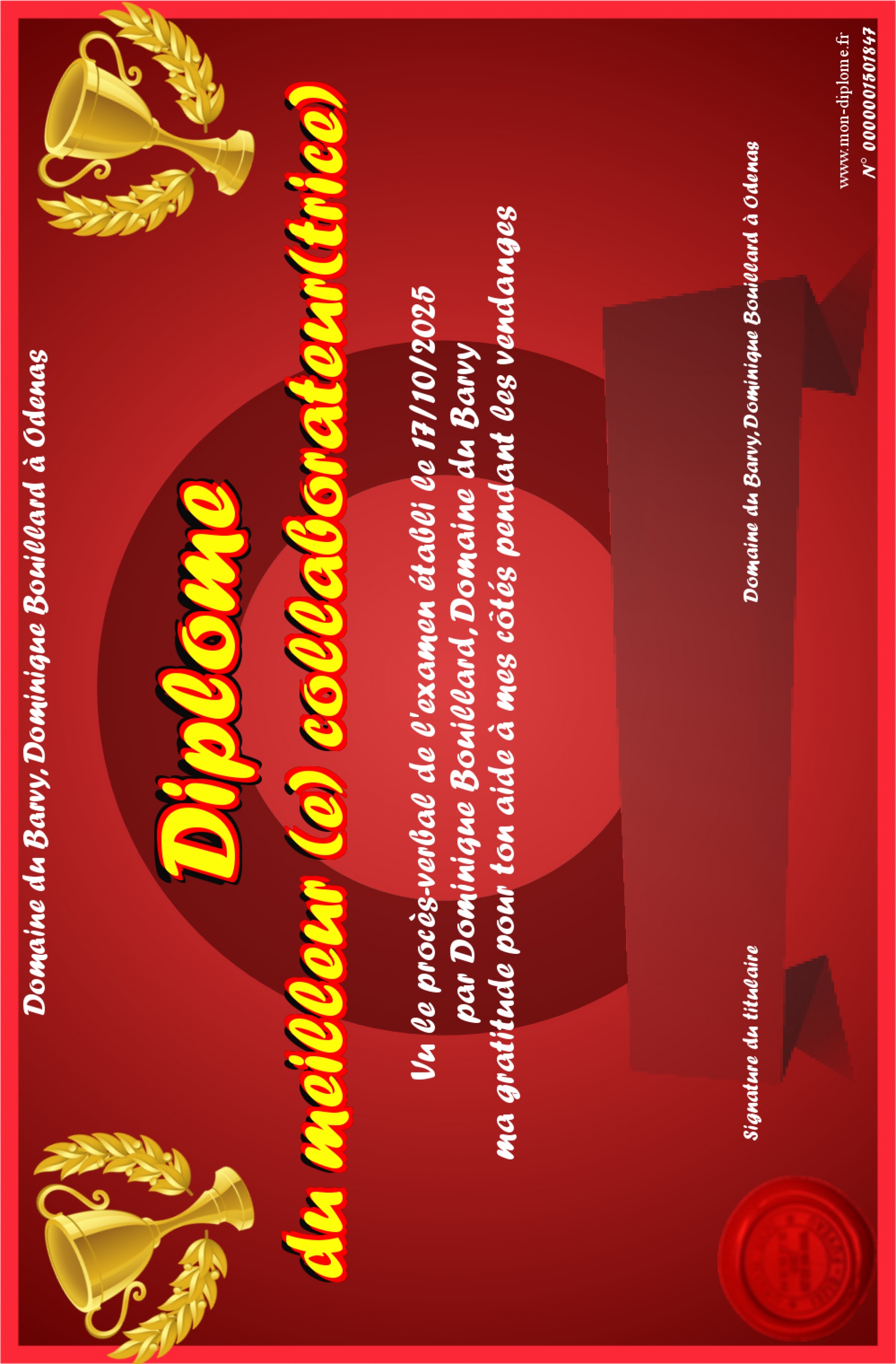 Envoyez par email votre Diplôme du meilleur (e) collaborateur(trice) personalisé