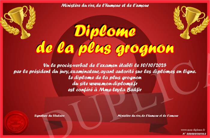 Envoyez par email votre Diplome de la plus grognon personalisé