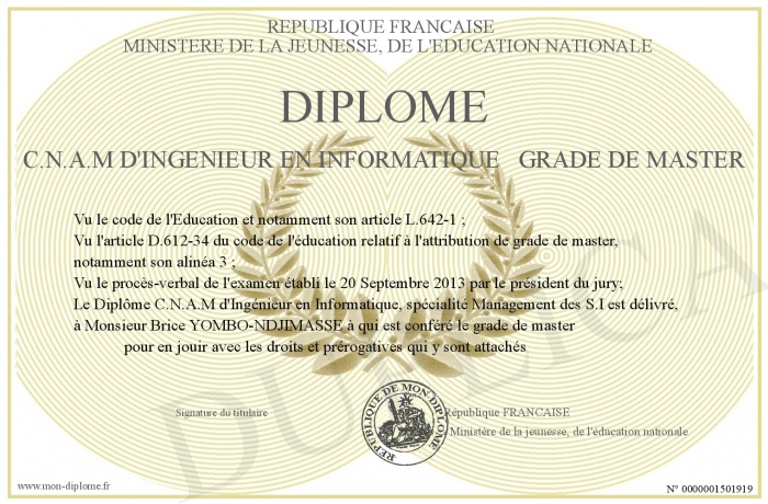 Envoyez par email votre Diplôme C.N.A.M d'Ingénieur en Informatique Grade de Master personalisé