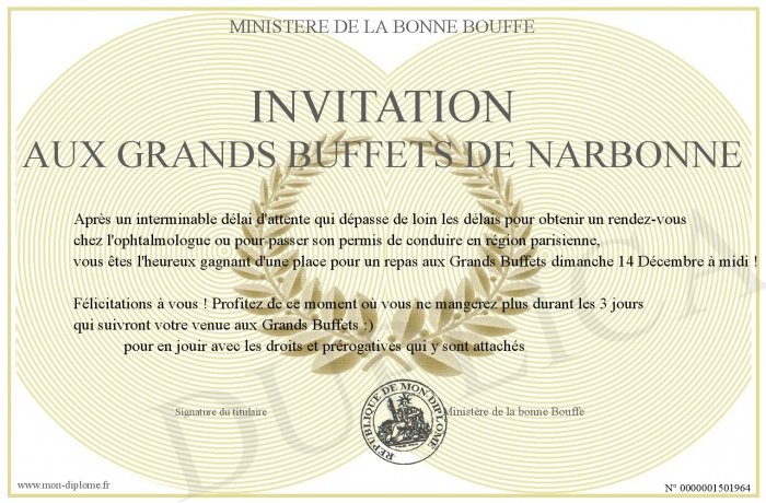 Envoyez par email votre Invitation aux Grands Buffets de NARBONNE personalisé