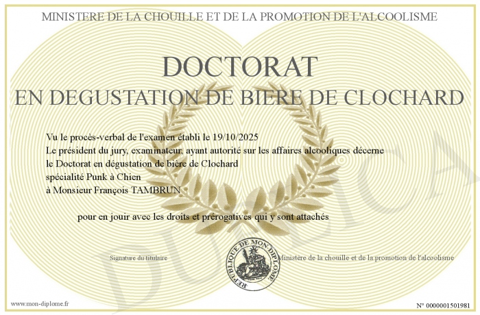 Envoyez par email votre Doctorat en dégustation de bière de Clochard personalisé