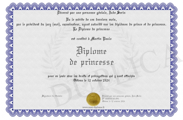 Envoyez par email votre Diplôme de princesse personalisé