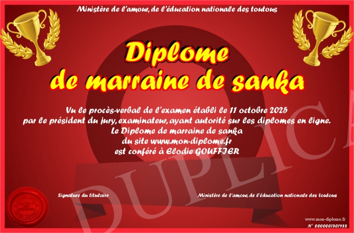 Envoyez par email votre Diplôme de marraine de sanka personalisé