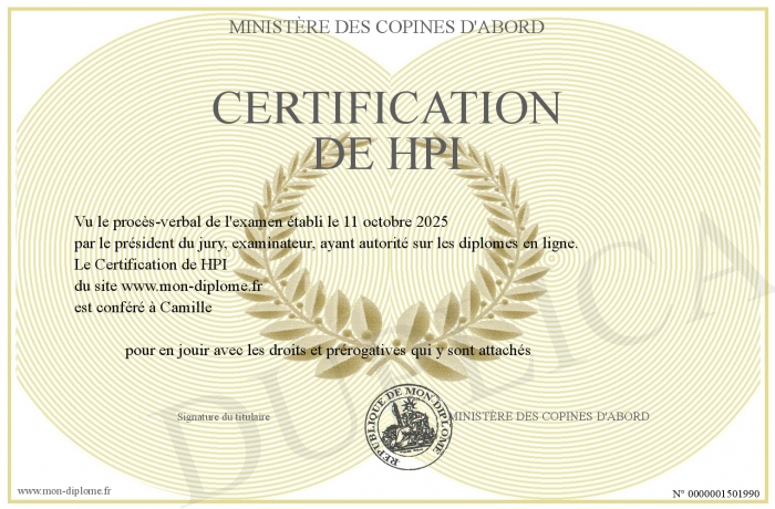 Envoyez par email votre Certification de HPI personalisé