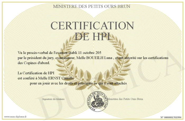 Envoyez par email votre Certification de HPI personalisé