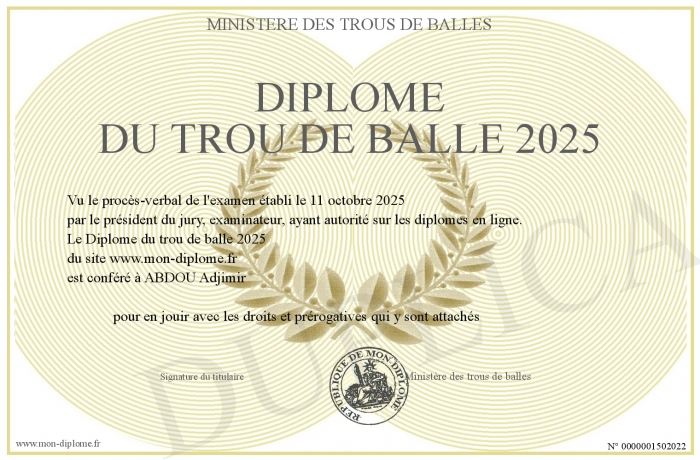 Envoyez par email votre Diplôme du trou de balle 2025 personalisé