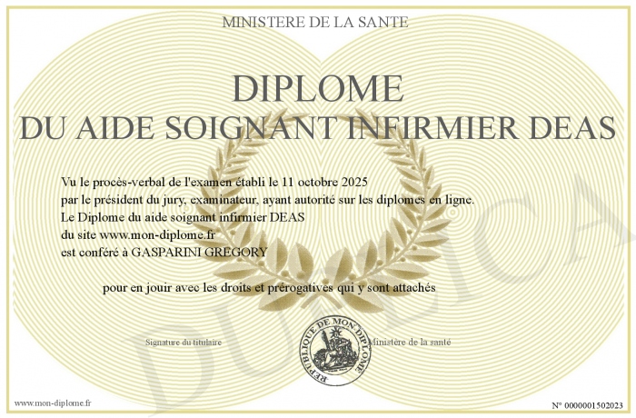 Envoyez par email votre Diplôme du aide soignant infirmier DEAS personalisé