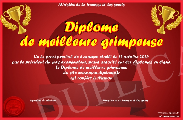 Envoyez par email votre Diplôme de meilleure grimpeuse personalisé