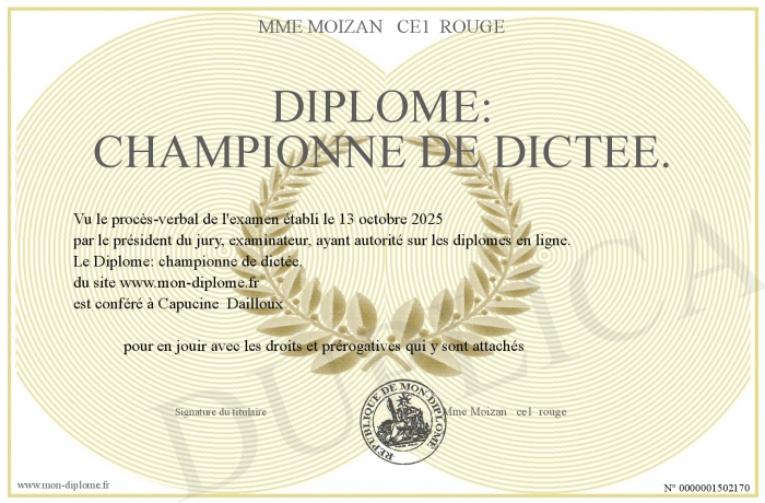 Envoyez par email votre Diplôme: championne de dictée. personalisé