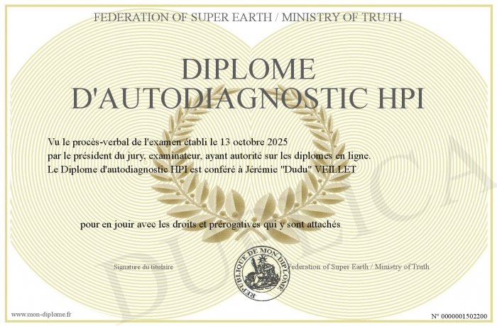 Envoyez par email votre Diplôme d'autodiagnostic HPI personalisé
