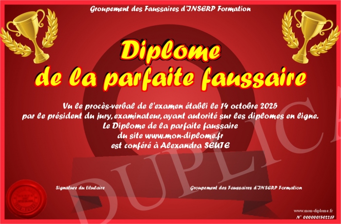 Envoyez par email votre Diplôme de la parfaite faussaire personalisé