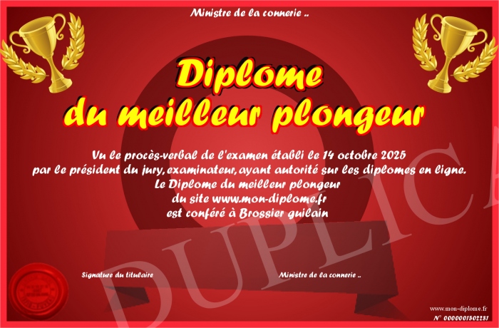 Envoyez par email votre Diplôme du meilleur plongeur personalisé