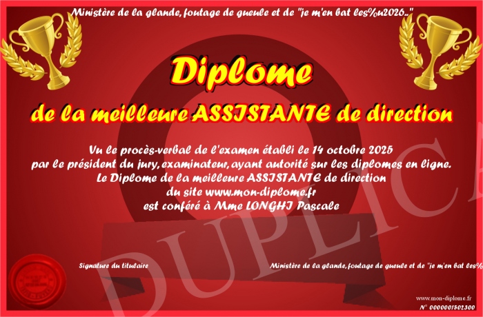 Envoyez par email votre Diplôme de la meilleure ASSISTANTE de direction personalisé