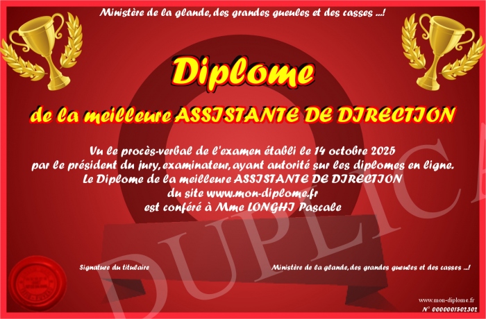 Envoyez par email votre Diplôme de la meilleure ASSISTANTE DE DIRECTION personalisé