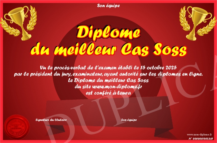 Envoyez par email votre Diplôme du meilleur Cas Soss personalisé