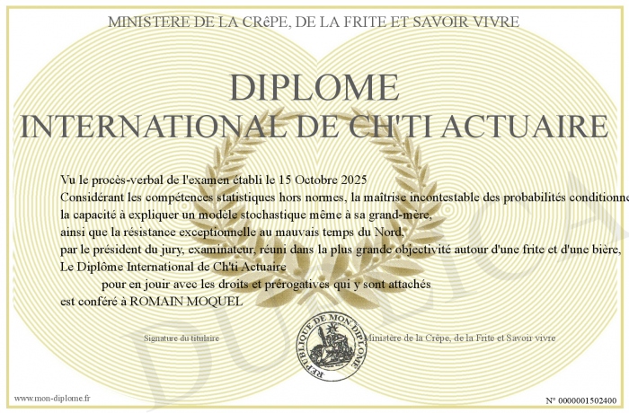 Envoyez par email votre Diplôme international de Ch'ti Actuaire personalisé