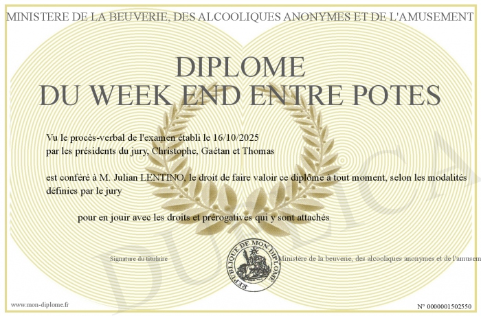 Envoyez par email votre Diplôme du Week End entre potes personalisé