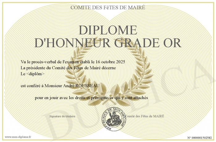 Envoyez par email votre Diplôme d'honneur grade Or personalisé