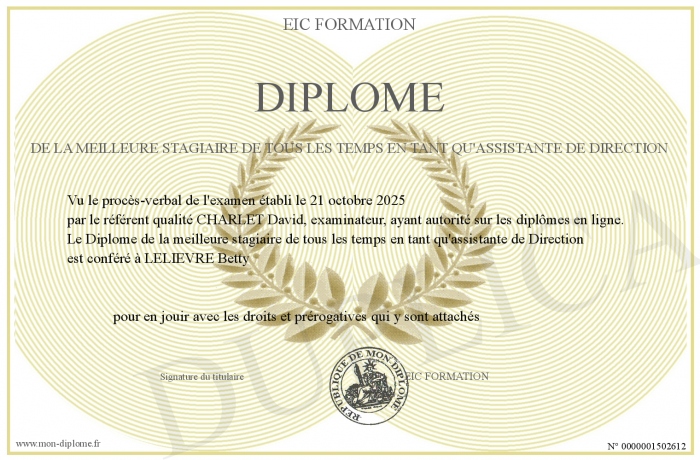 Envoyez par email votre Diplôme de la meilleure stagiaire de tous les temps en tant qu'assistante de Direction personalisé