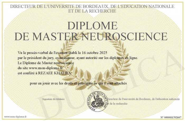 Envoyez par email votre Diplôme de Master neuroscience personalisé