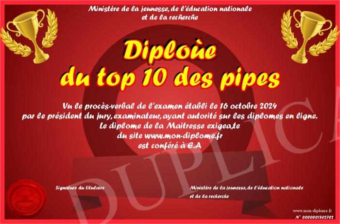 Envoyez par email votre Diploùe du top 10 des pipes personalisé