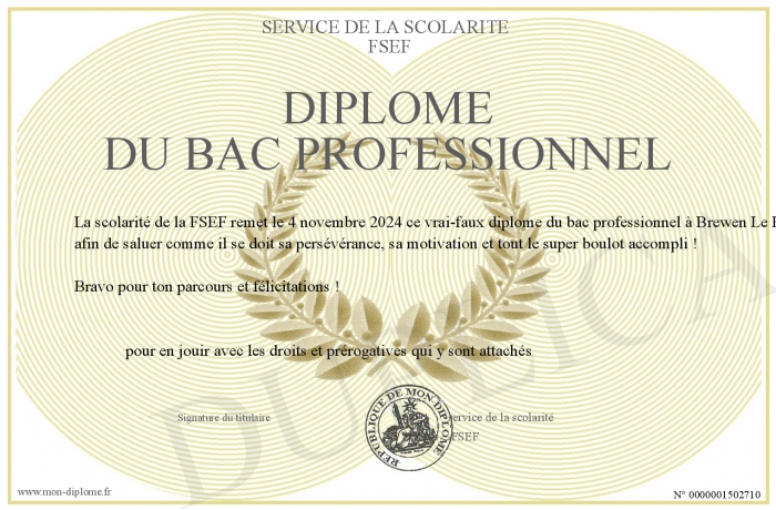 Envoyez par email votre diplôme du bac professionnel personalisé