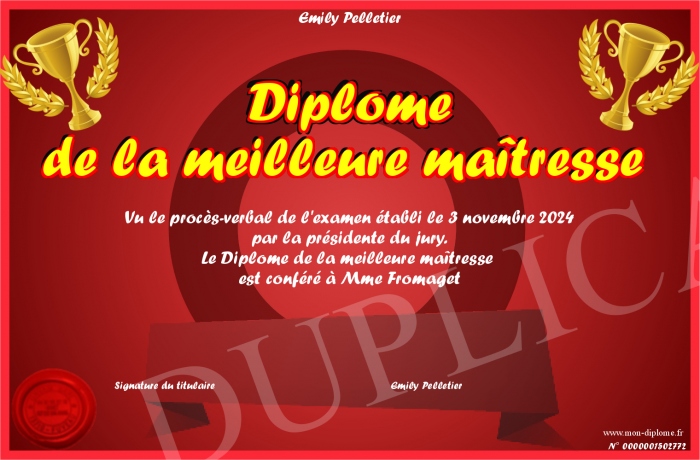 Envoyez par email votre Diplôme de la meilleure maîtresse personalisé