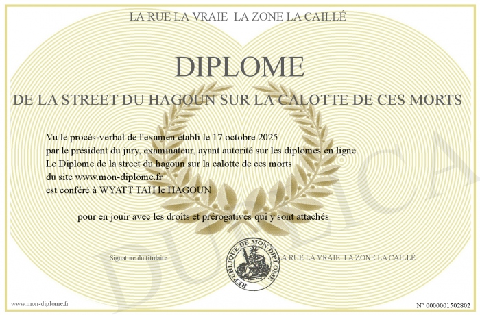 Envoyez par email votre Diplôme de la street du hagoun sur la calotte de ces morts personalisé