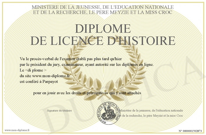 Envoyez par email votre Diplôme de Licence d'histoire personalisé