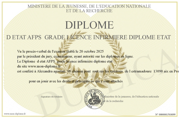 Envoyez par email votre Diplome d etat AFPS grade licence infirmière diplôme etat personalisé