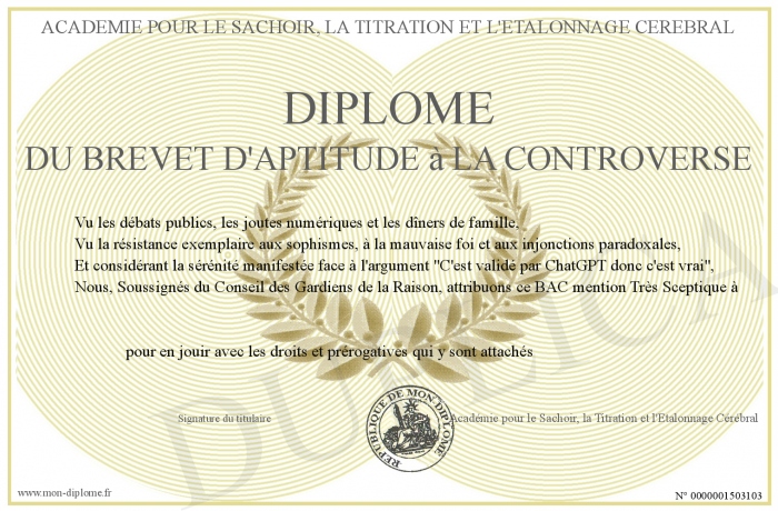 Envoyez par email votre Diplôme du Brevet d'Aptitude à la Controverse personalisé