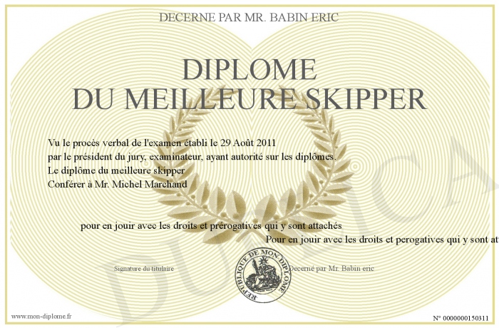 Envoyez par email votre Diplôme du meilleure skipper personalisé