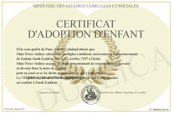 Envoyez par email votre CERTIFICAT D'ADOPTION D'ENFANT personalisé