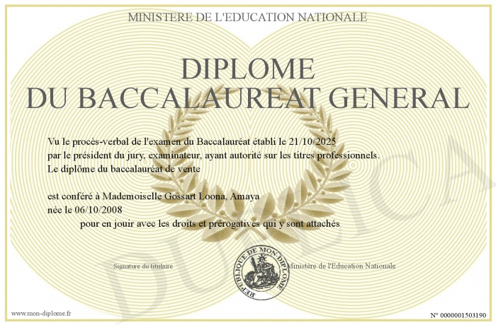 Envoyez par email votre Diplôme du baccalaureat général personalisé