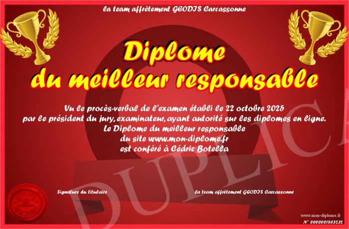 Envoyez par email votre Diplôme du meilleur responsable personalisé