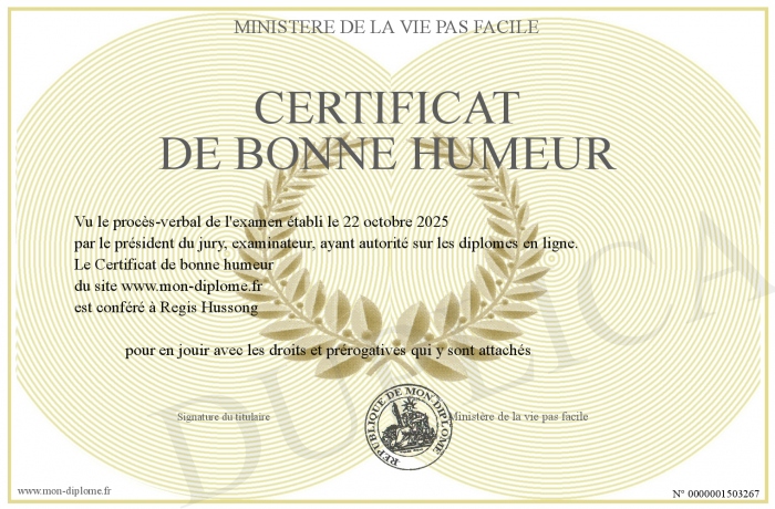 Envoyez par email votre Certificat de bonne humeur personalisé