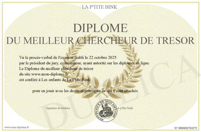 Envoyez par email votre Diplôme du meilleur chercheur de trésor personalisé