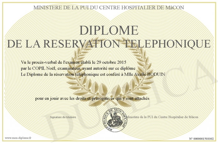 Envoyez par email votre Diplôme de la réservation téléphonique personalisé