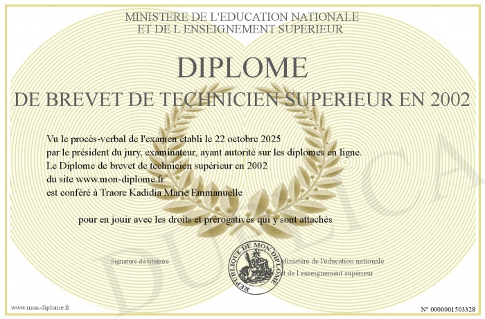 Envoyez par email votre Diplôme de brevet de technicien supérieur en 2002 personalisé
