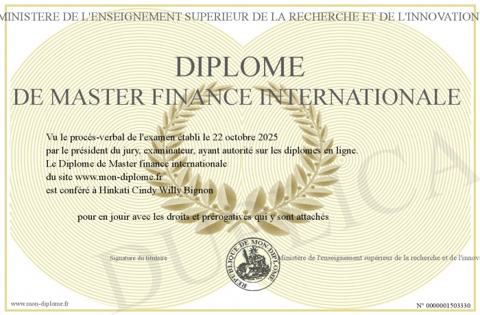 Envoyez par email votre Diplôme de Master finance internationale personalisé