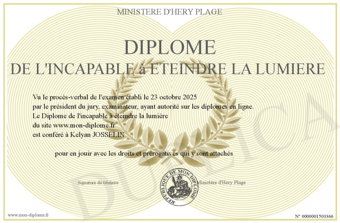 Envoyez par email votre Diplôme de l'incapable à éteindre la lumière personalisé