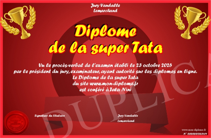Envoyez par email votre Diplôme de la super Tata personalisé